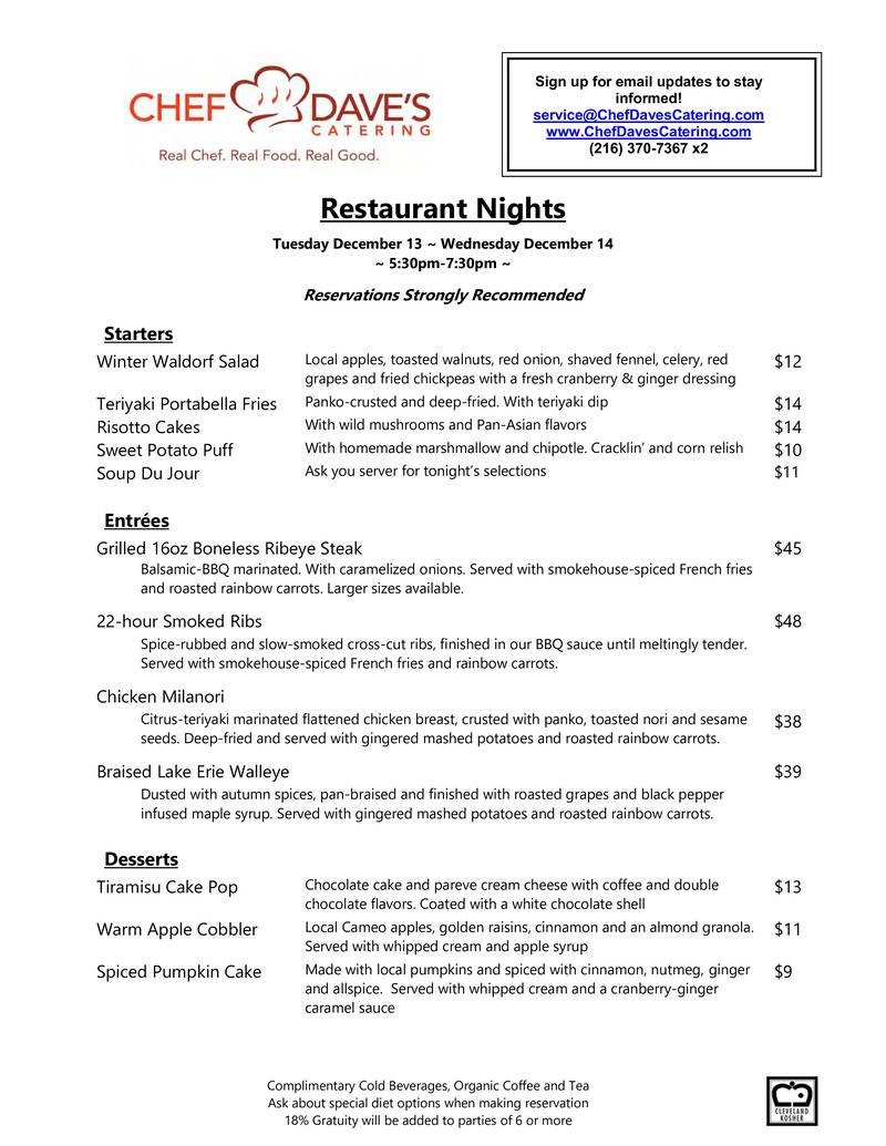 Our next set of Restaurant Nights will be Tuesday 12/13 & Wednesday 12/14. A menu is attached and can also be downloaded at https://chefdavescatering.com/