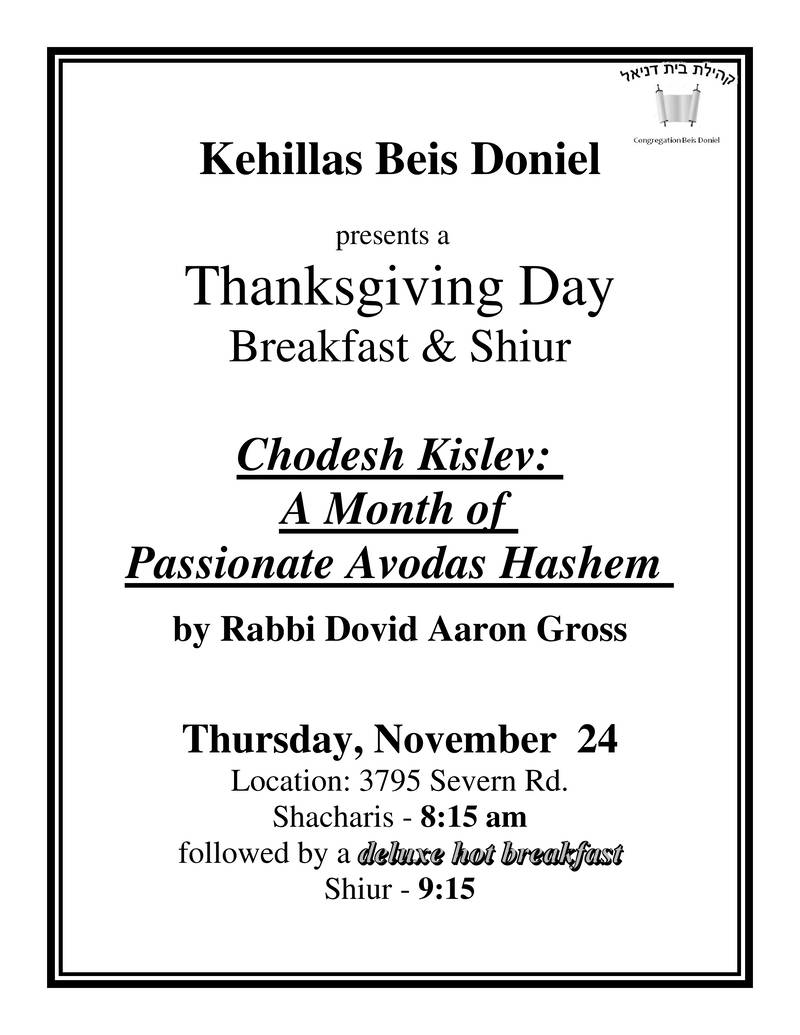Thanksgiving Day Breakfast & Shiur at Kehillas Beis Doniel