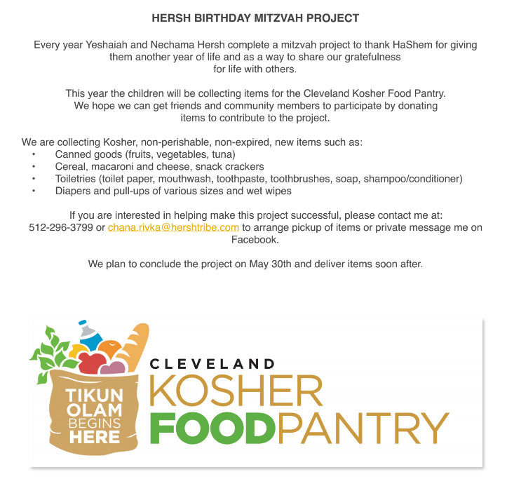 Hersh Birthday Mitzvah Project with Cleveland Kosher Food Pantry