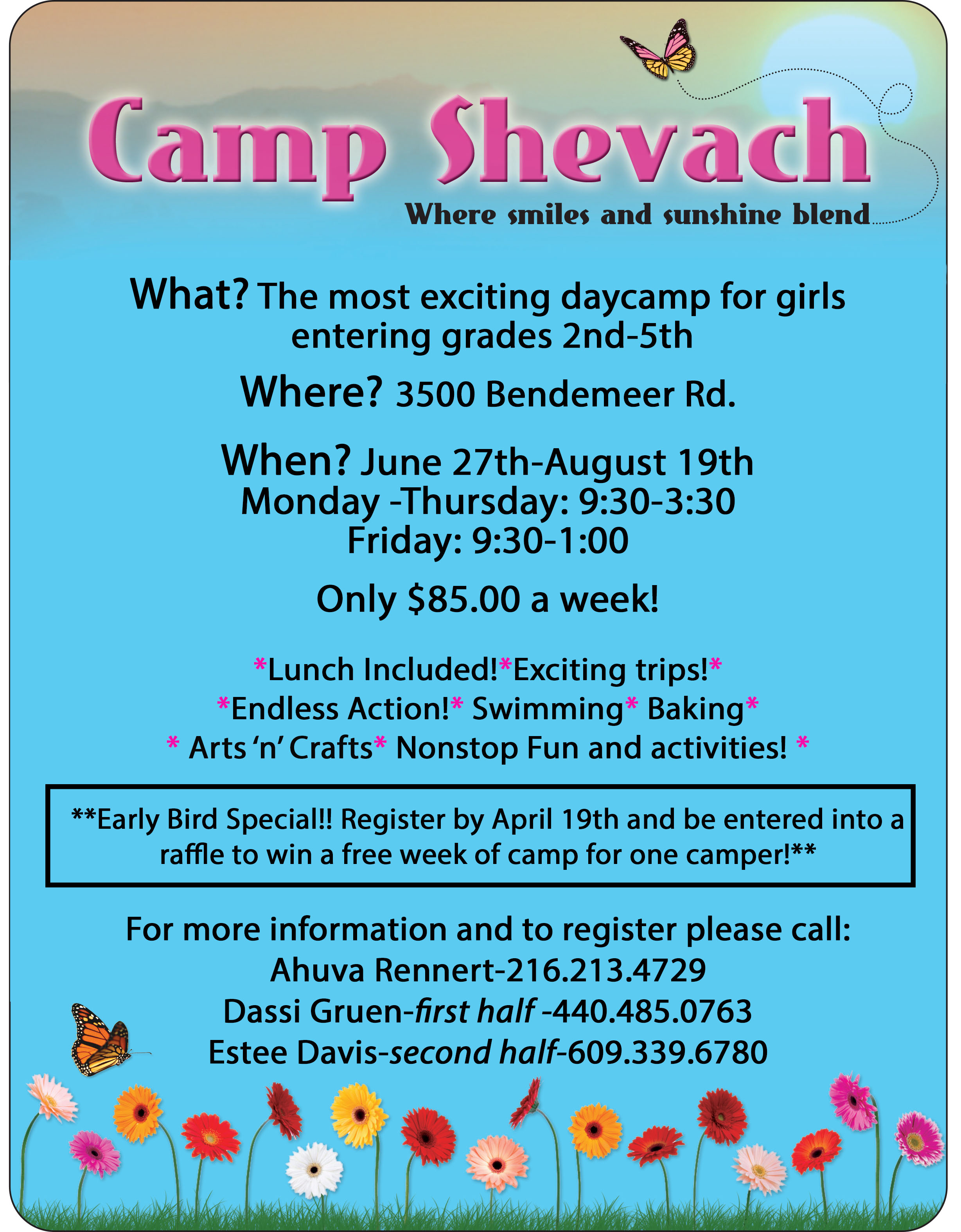 For the rest of the month of May, anyone that signs up for the entire Camp 2016 Season at Camp Chabad, that’s 8 full weeks of a funtastic summer will pay only $500 for the entire summer. Email Jill Weiszner now atJiris770@aol.com or text 216 402 4877.