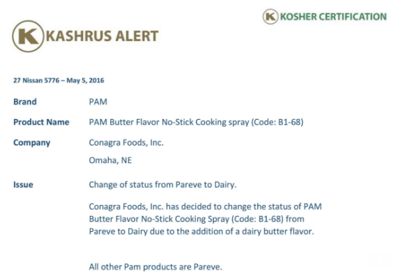 PAM BUTTER Flavor No-stick Cooking Spray Now Dairy Status
