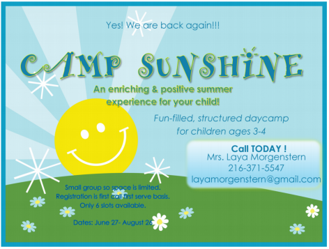 Yes! We are back again! Camp Sunshine! Provide your child with a positive and enriching summer experience. Full summer. Air conditioned facilities. With enclosed backyard. Experienced Morah and Mommy. First aid and CPR certified. Small group. Only 3 Slots left!. Call Today! 216-371-5547