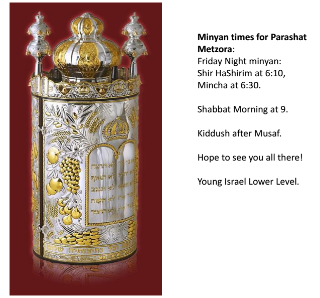 - Shabbos HaGadol Drasha for the Women of the community at Rabbi and Rebbetzin Denciger’s home, 4380 University Parkway, University Hts, at 5 pm.