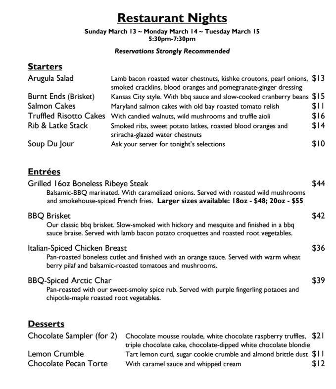 This will be our last set of Restaurant Nights until Pesach, when we will be having them over Chol HaMoed. Our next set of Restaurant Nights will be next Sunday 3/13, Monday 3/14 and Tuesday 3/15. A hi-res menu can be downloaded here >>