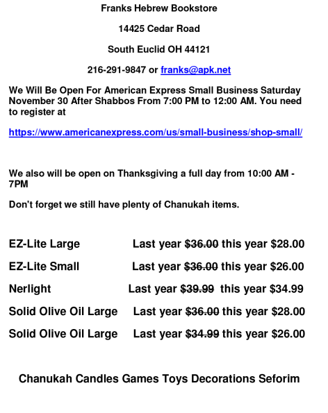 Frank’s Hebrew Books Open for AMEX Small Business Saturday & Thanksgiving – Still Plenty of Chanukah Items