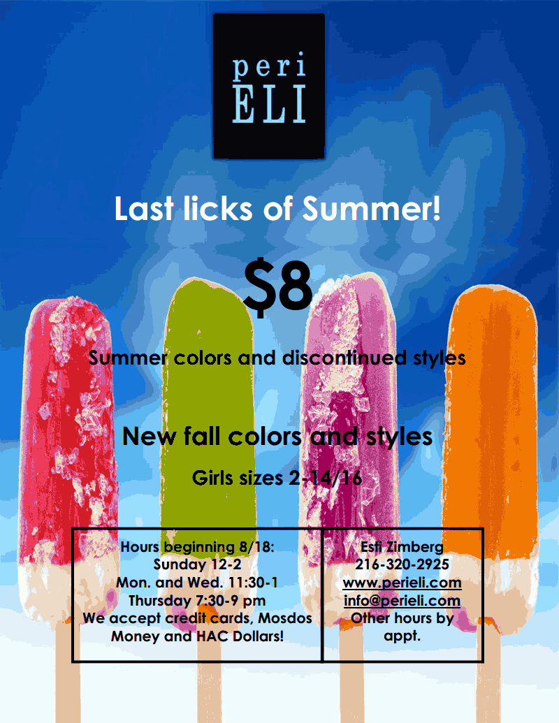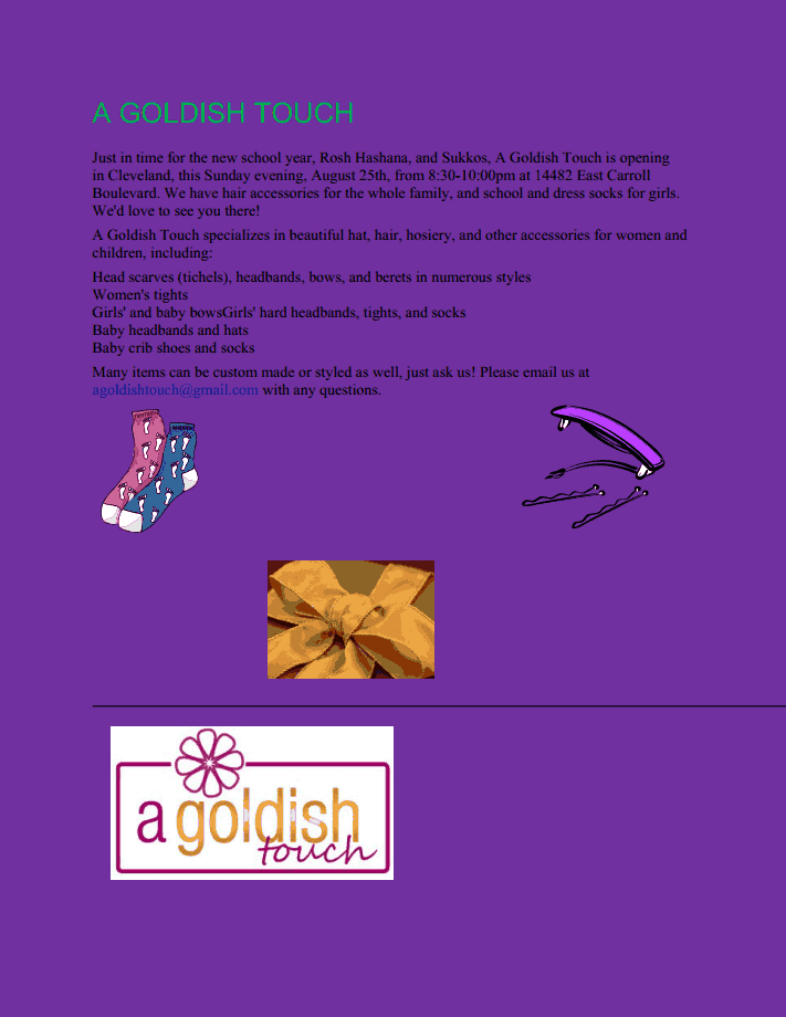 Just in time for the new school year, Rosh Hashana, and Sukkos, A Goldish Touch is opening in Cleveland, this Sunday evening, August 25th, from 8:30-10:00pm at 14482 East Carroll Boulevard. We have hair accessories for the whole family, and school and dress socks for girls. We’d love to see you there!