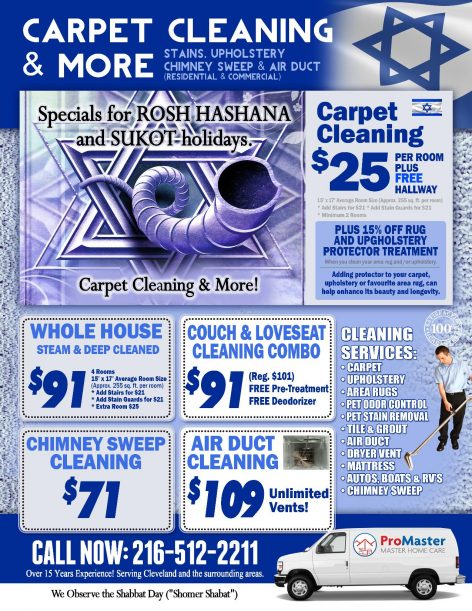 Make an appointment today to be sure you get your carpets done before Rosh HaShana!! We also offer a variety of cleaning services: upholstery, rugs, pet odors and stains, tile and grout, air vents, and more!!