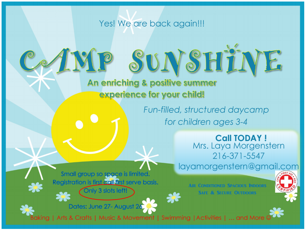 Yes! We are back again! Camp Sunshine! Provide your child with a positive and enriching summer experience. Full summer. Air conditioned facilities. With enclosed backyard. Experienced Morah and Mommy. First aid and CPR certified. Small group. Only 3 Slots left!. Call Today! 216-371-5547