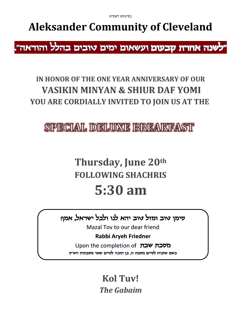 Aleksander Community of Cleveland 1 Year Anniversary of Vasikin Minyan and Shiur Daf Yomi Breakfast
