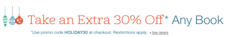 Up until November 29th, Amazon has an amazing offer. You get 30% off any Amazon Hardcover book ! Just enter the code HOLIDAY30 at checkout. This is in addtion to their already low prices and free Prime shipping.