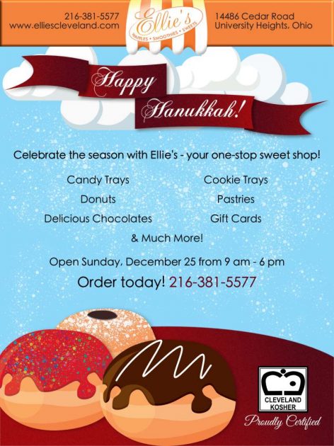 Celebrate Chanukah with Ellie’s – the one-stop shop for all your party needs! Stop by our store to browse our daily selections, or call us today to order fresh sufganiyot, challah, cookie trays, candy trays, donuts, and pastries for your holiday gathering. We also have many delicious varieties of popcorn and chocolates! Our candy and cookie trays make perfect gifts, and we also have gift cards available! Open Sunday, December 25 from 9 am – 6 pm!