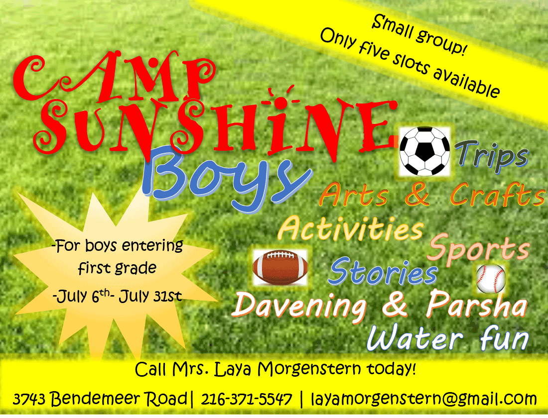 Camp Chabad is pleased to announce The Summer of 2014 – 5774. June 23 – Aug. 15. Monday thru Friday, 9:30 AM til 3:30 PM. A limited amount of partial scholarships are available to qualifying participants. Please contact Jill Weiszner for available Job Opportunities @ Jiris770@aol.com or text 216 402 4877. Click here to download a sign-up form>>