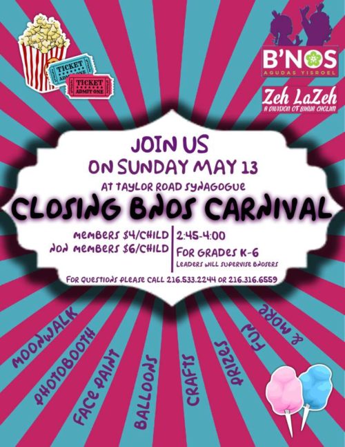 Chaim Weiszner will once again be cooking his delicious burgers and hotdogs along with various salads so bring all of your families and friends to this once a year event!