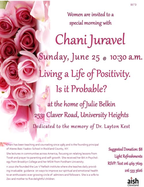 Aish Presents “Living a Life of Positivity. Is it Probable?” with Chani Juravel, Sunday, June 25