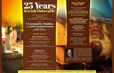 The Jewish Learning Connection will be celebrating its twenty-fifth anniversary with a special dessert reception program Motzoei Shabbos November 23 at the JCC. Guest speaker is scholar and prolific writer Rabbi Yitzchak Breitowitz who will talk about The Goals of Jewish Education: Revealing the Beauty Within. Entertainment will be provided by well-known humor columnist Mordechai Schmutter. Tickets are $25. Please call JLC at 216-691-3837 or e-mail at register@clevelandjlc.com.