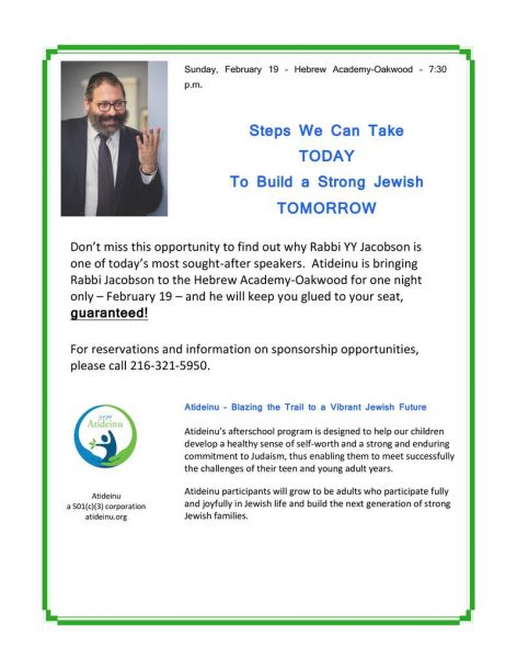 On Sunday night, Feb. 19, Rabbi YY Jacobson addressed an overflow crowd at the Hebrew Academy – Oakwood. If you were there, you know that the air was electric with excitement as the audience was held spellbound by Rabbi Jacobson’s insight, humor and comprehensive Torah knowledge. Speaking on behalf of Atideinu, Rabbi Jacobson stressed the importance of being proactive in working with kids, and complimented Cleveland on having the leading-edge program for children in this area.