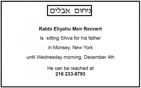 We regret to inform you of the passing of Matthew Kalman, brother of Michael Kalman. Funeral already occurred in Boston. Shiva will be at his home, 3704 Berkeley Road in Cleveland Heights, starting Tuesday morning until Sunday morning. Minyanim: Shacharis: 7:00 am, Mincha/Maariv: 7:15 pm.