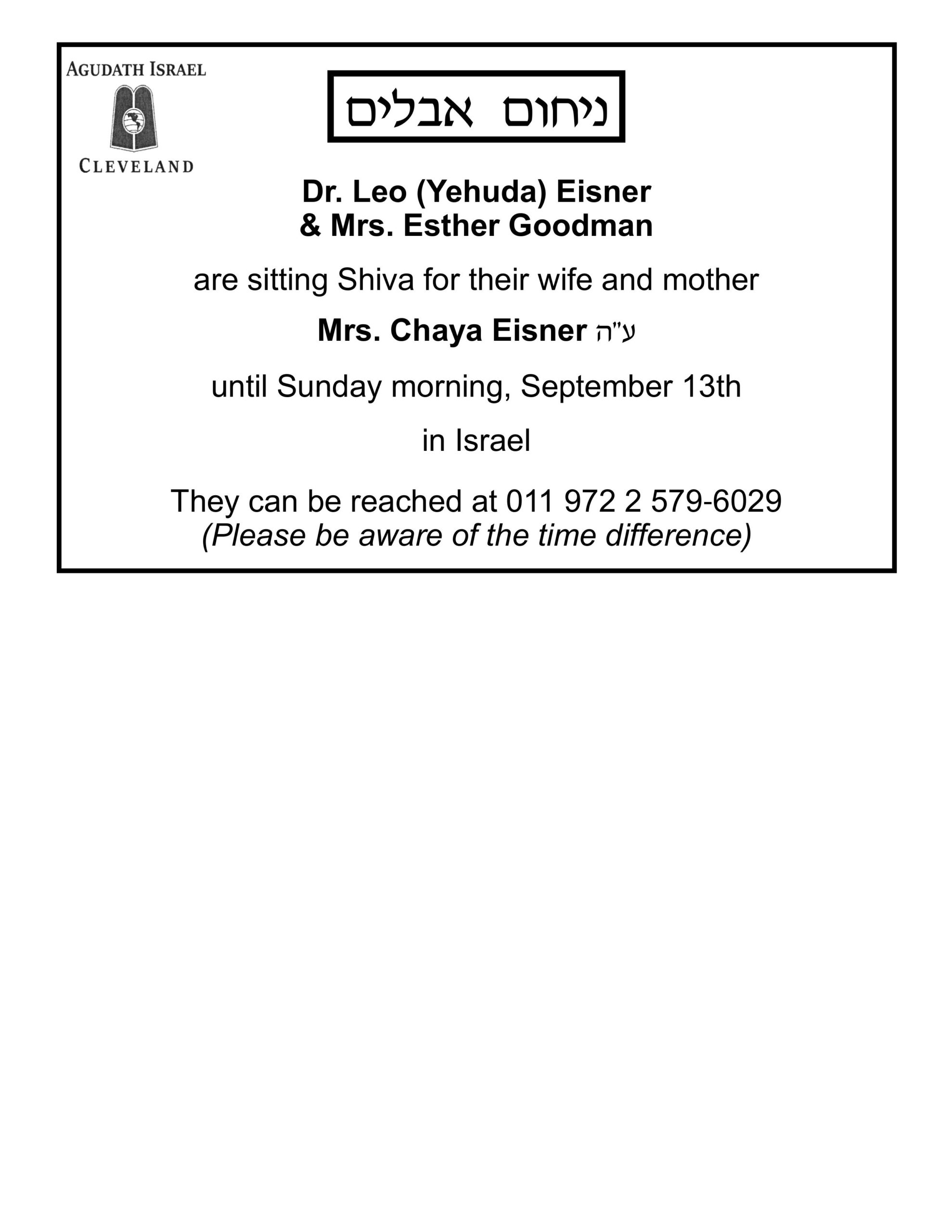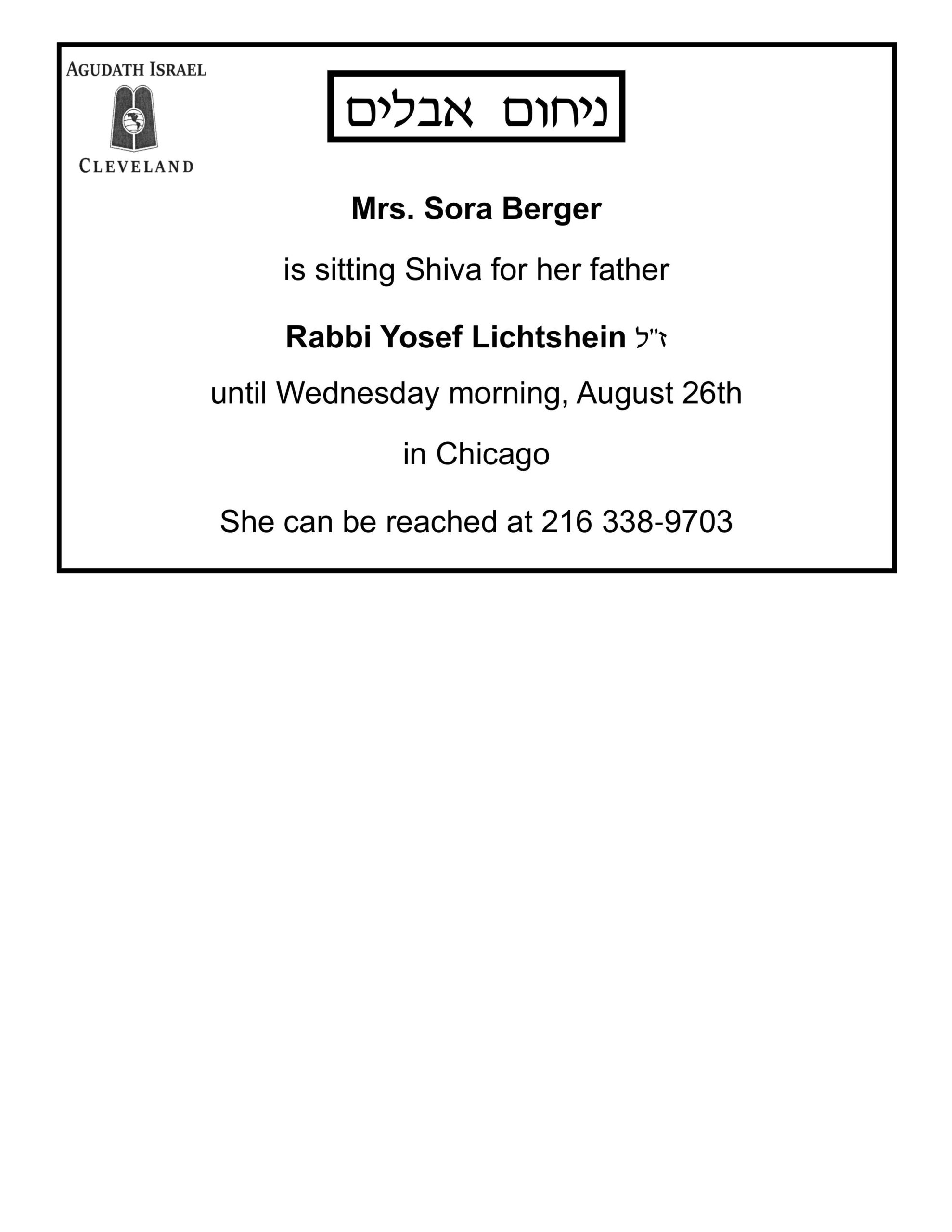 The shiva will be at 14493 Summerfield Road. Masks are required. The shiva will be completed on Thursday morning after Shacharis.