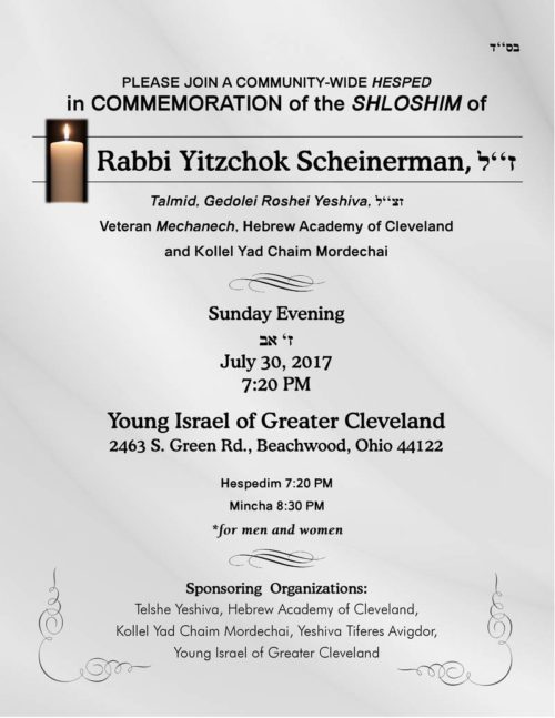 The shloshim siyum for Gavriel Heller will be Thursday evening at 7:30 at the JLC Waxman Torah Center. Men and Women are invited.