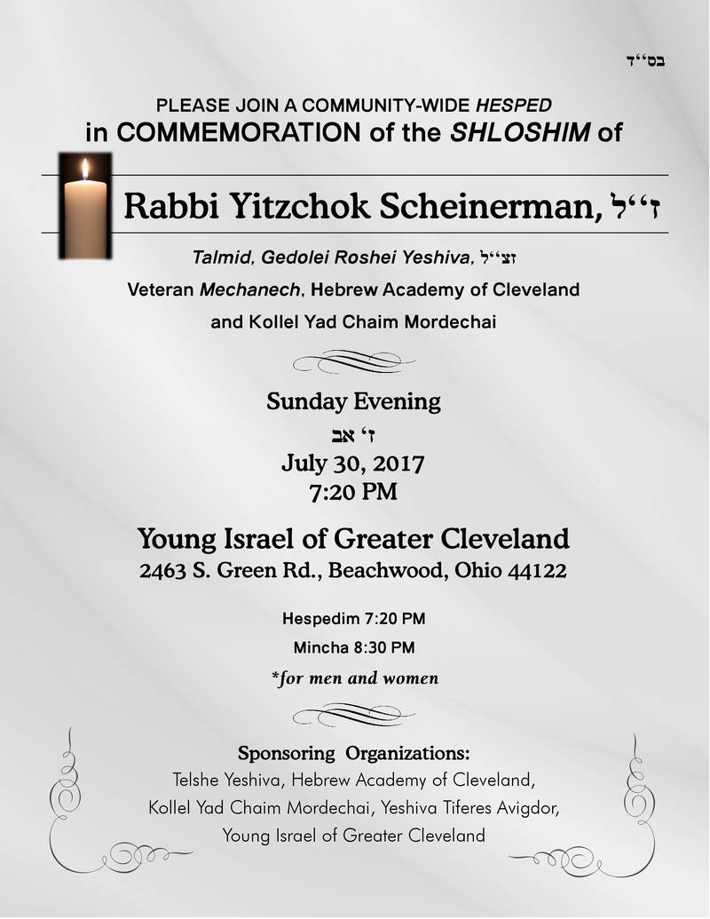 The shloshim siyum for Gavriel Heller will be Thursday evening at 7:30 at the JLC Waxman Torah Center. Men and Women are invited.