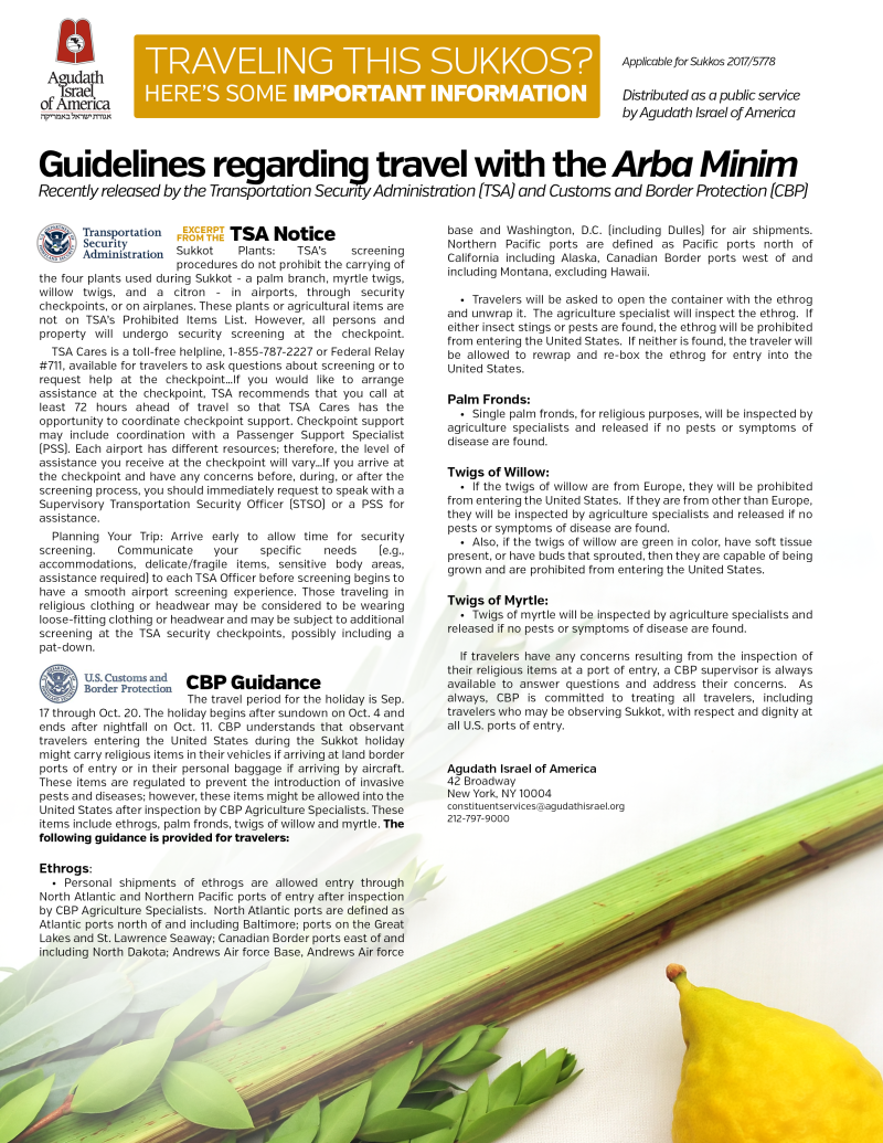 As in past years, Agudath Israel of America’s Washington Office has worked closely with agencies of the U.S. Department of Homeland Security to help avoid potential problems for travelers carrying arba minim.