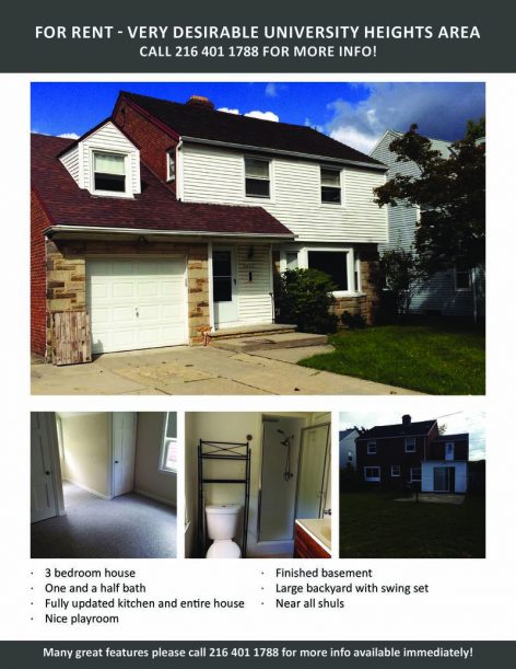 Newly updated house for rent on Bromley Rd. 3 bedrooms and 1.5 bathrooms. Eat-in kitchen, spacious living/dining area, family room with built-ins, 1st floor laundry, and carpeted basement. Approximately 1900 sq. ft. For more information please call 216-912-8885.