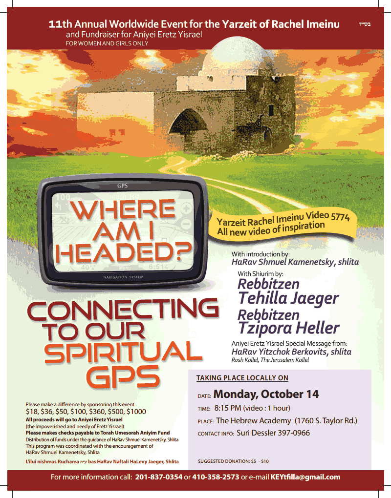 11th Annual Worldwide Event for the Yahrtzeit of Rachel Imein- “Where am I headed?”